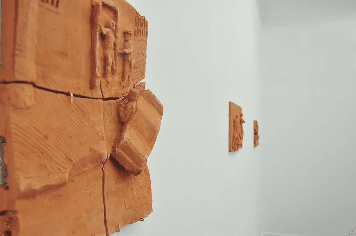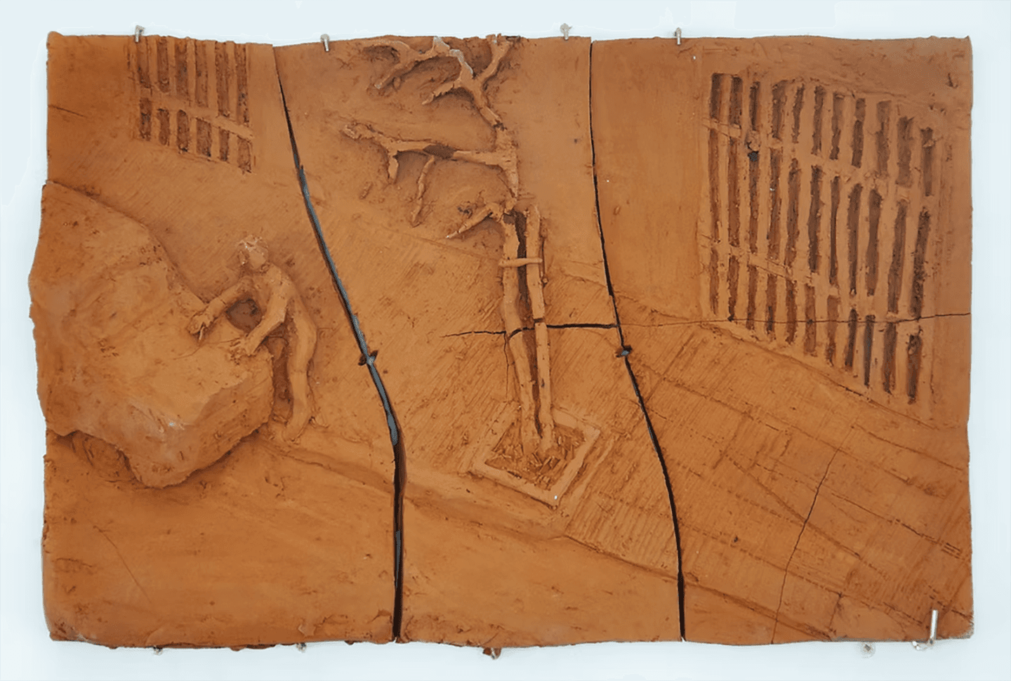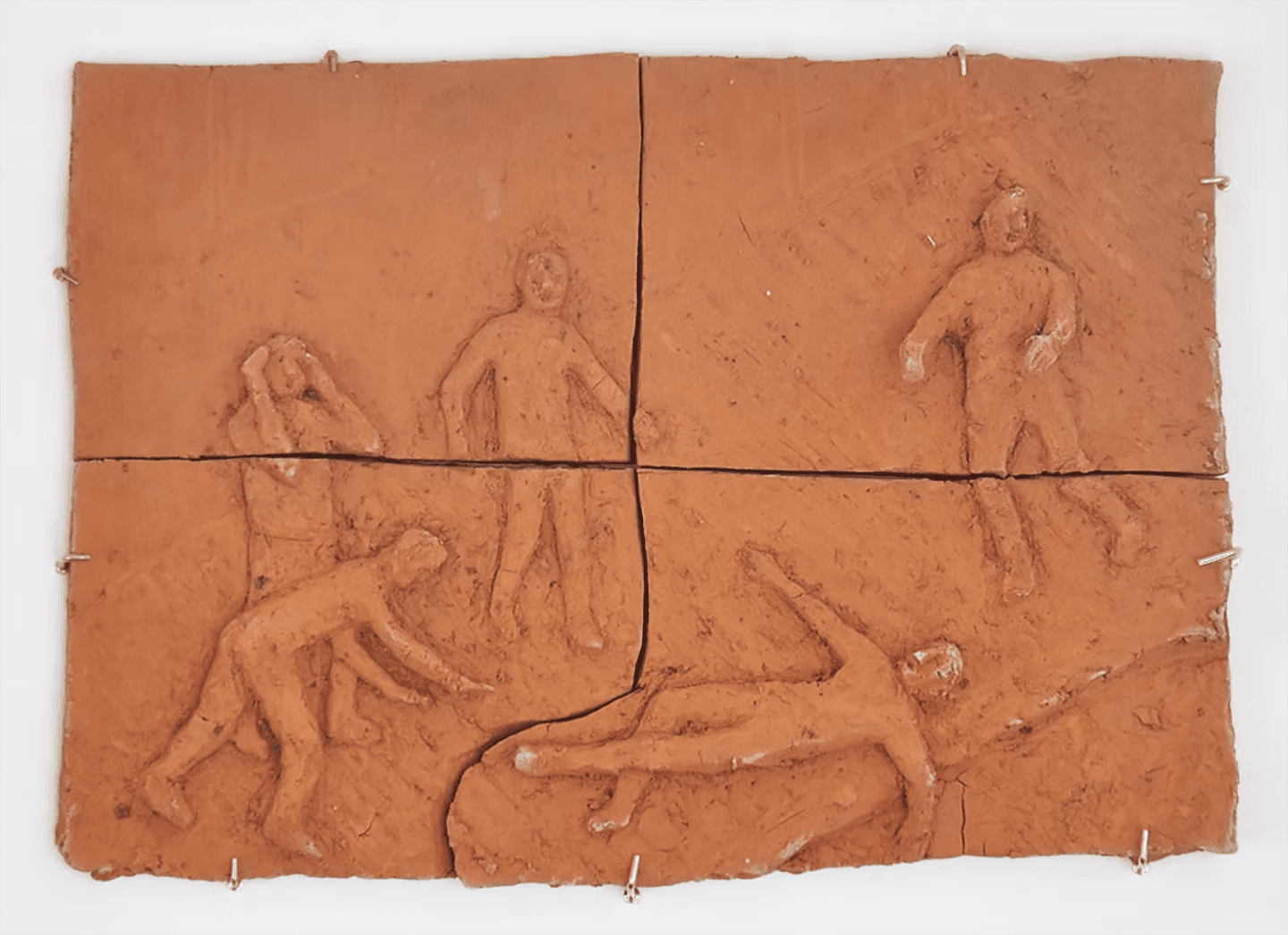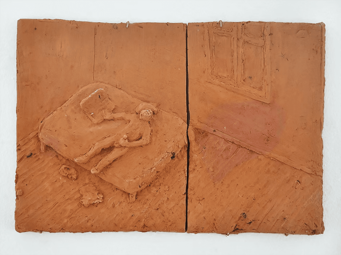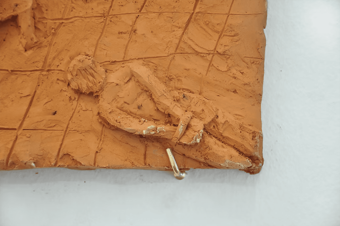 Como en un sistema de reenvíos, las obras atraviesan el mismo proceso de elaboración que un ladrillo, unidad mínima de la construcción. Todo se detiene al nivel del relieve, no hay superficies de inscripción, no hay grafitis en las fachadas, así como no hay tatuajes ni vestimentas, a excepción de un pantalón caído que acentúa la desnudez, una gorra de policía y un chaleco antibalas.