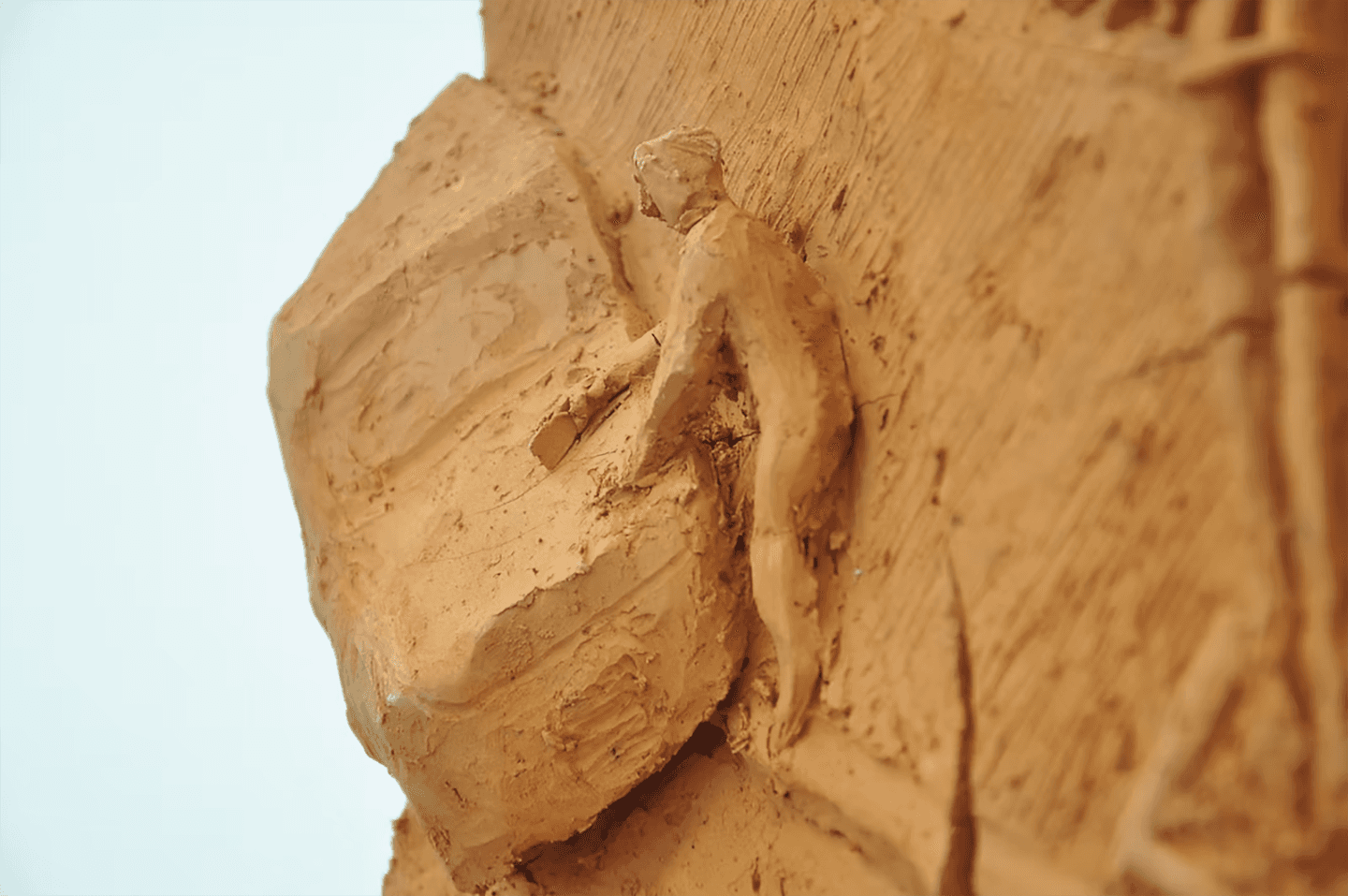 Existe una profecía bíblica que sostiene su parábola en la imposibilidad de unir hierro con barro. Cantini produce, al interior de su obra, una aleación de elementos de naturaleza opuesta. Barro seleccionado y extraído manualmente de las costas isleñas del Paraná, en lenta recuperación de la bajante histórica de 2020 y del fuego sojerocerdoinmobiliario, es transportado en una bolsa de consorcio a través del río hasta una casa-taller, donde es amasado y modelado, dibujado con alambres y palitos, esculpido con un tramontina o con una tarjeta de plástico intervenida para dar relieve a una persiana. Simbólicamente, el barro hace su regreso a la ciudad, de donde fue expulsado, y se convierte en materia prima de las formas urbanas.