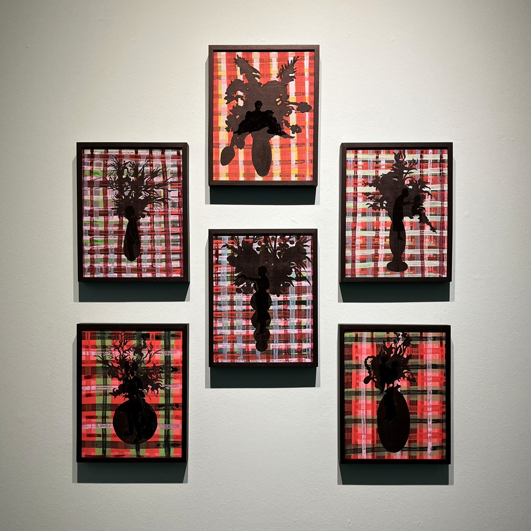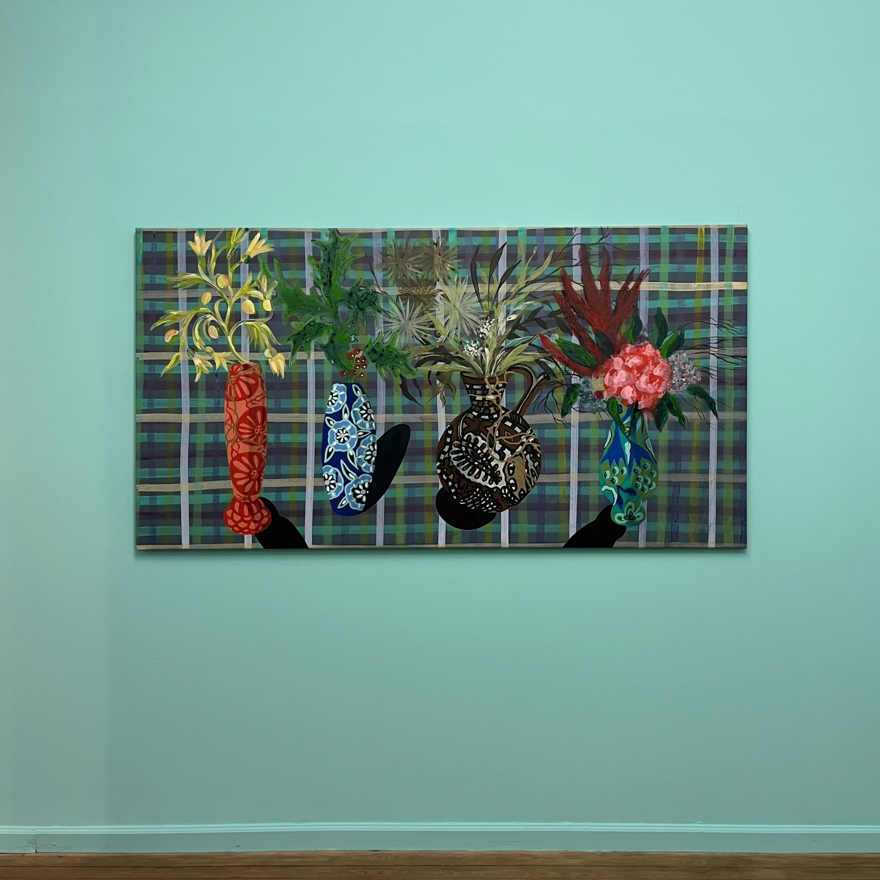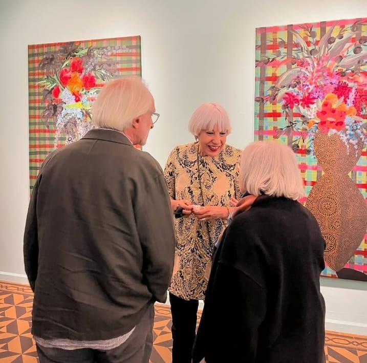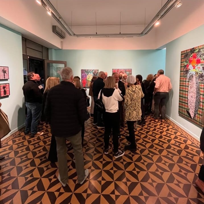 Las flores están allí para mostrarnos belleza, momentos en la vida: un agasajo o una despedida, para celebrar y acompañar lo cotidiano y es el mantel que cubre las mesas el maestro de ceremonia ornamental, porque lo bello y lo decorativo es sello de la artista quien lo valora y destaca. Las flores de ceibo rojas y negras invaden con naturalidad la sala como si quisieran dar el presente para no olvidar el lugar en donde nos encontramos. Una pintura de grandes dimensiones nos enfrenta al glamour del diseño, otro de los temas relevantes en la obra de la pintora, y el suceso no revelado y sus circunstancias, quién lo vistió o lo vestirá y cuál fue o será la ocasión de la gala.