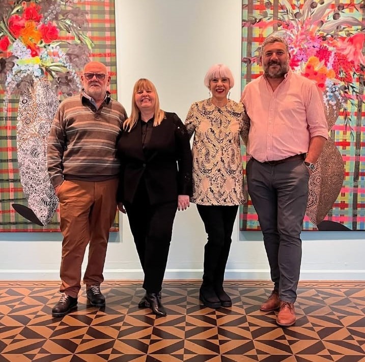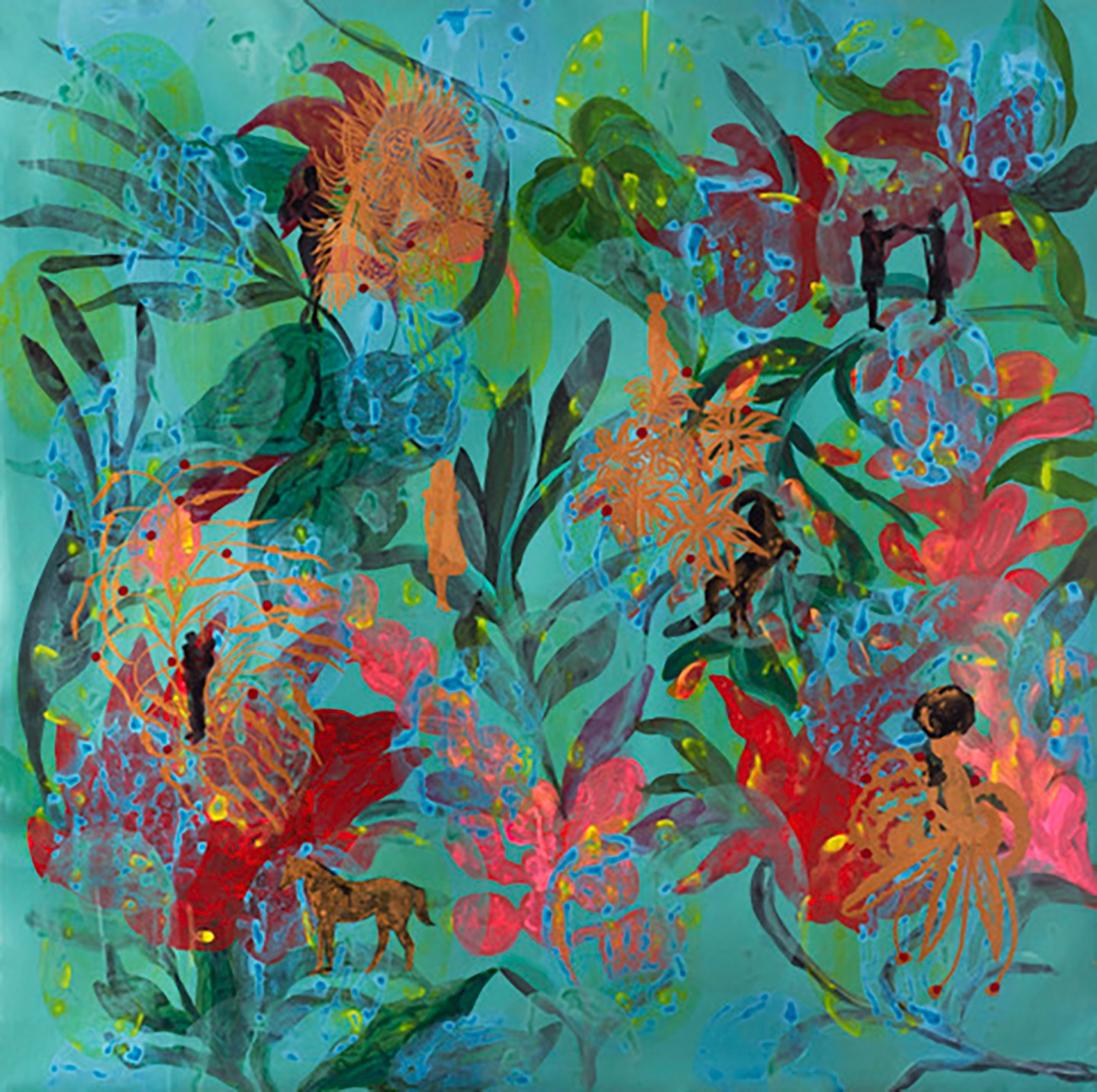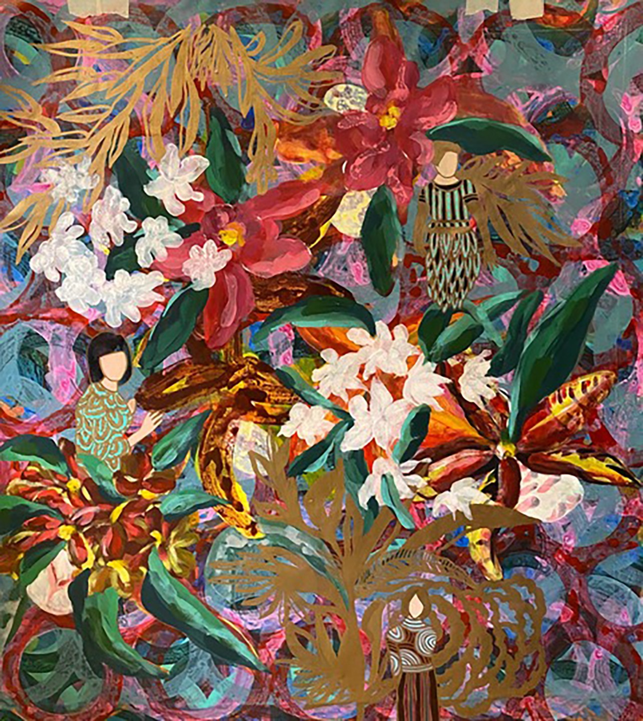 Las flores están allí para mostrarnos belleza, momentos en la vida: un agasajo o una despedida, para celebrar y acompañar lo cotidiano y es el mantel que cubre las mesas el maestro de ceremonia ornamental, porque lo bello y lo decorativo es sello de la artista quien lo valora y destaca. Las flores de ceibo rojas y negras invaden con naturalidad la sala como si quisieran dar el presente para no olvidar el lugar en donde nos encontramos. Una pintura de grandes dimensiones nos enfrenta al glamour del diseño, otro de los temas relevantes en la obra de la pintora, y el suceso no revelado y sus circunstancias, quién lo vistió o lo vestirá y cuál fue o será la ocasión de la gala.
