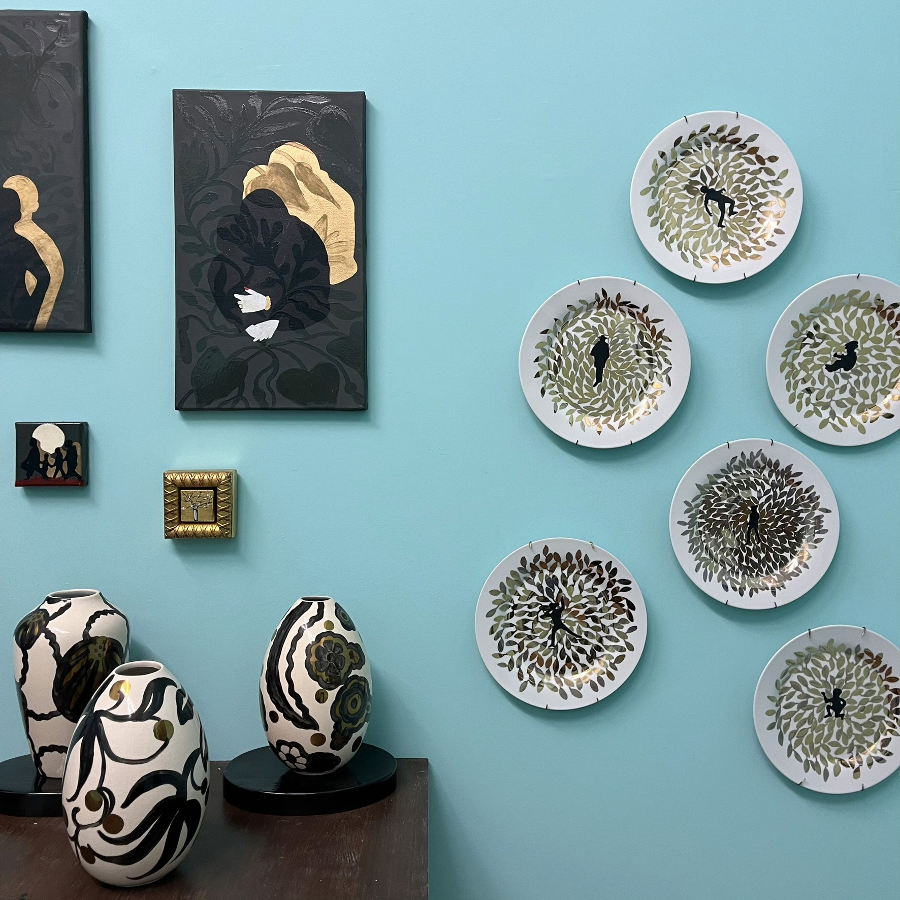 En la sala contigua a la principal los jarrones de cerámica y oro, los platos y obras de pequeño formato parecieran invitarnos a participar de un salón íntimo donde Carolina nos espera para tomar el té, compartir recuerdos y contarnos de sus próximos proyectos.