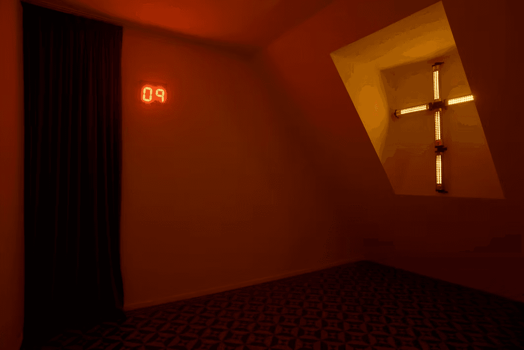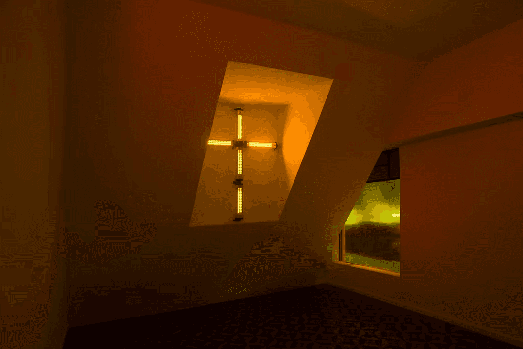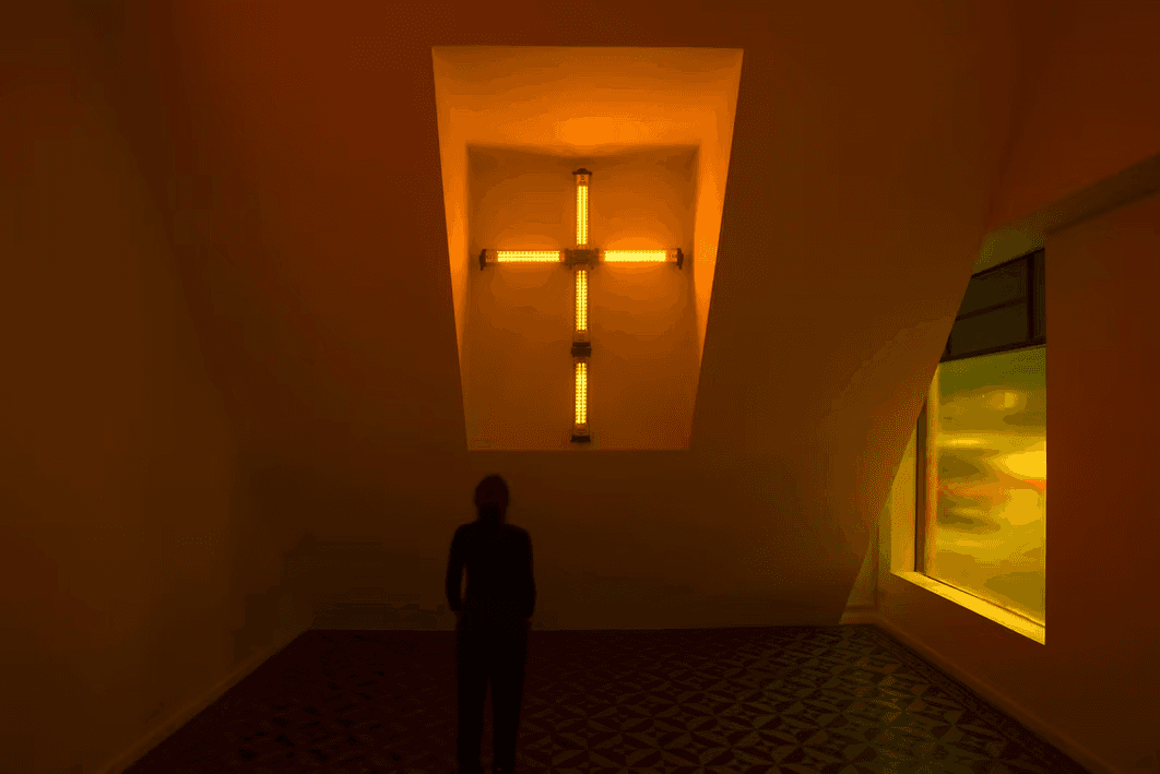 Usurpa además la arquitectura parroquial, o la tipología del sitio de adoración, como otra expresión grosera de lo dado (el templo solía ser el edificio más expresivo e influyente de cualquier lugar). Una cosa más: usurpa la expresión clásica del templo sobre el cuerpo a través del nexo físico entre el objeto y el espacio, un nexo mediado por la luz, la temperatura y el sonido (otra cosa más: la experiencia espacial de lo sublime-monumental como disciplinadora social).