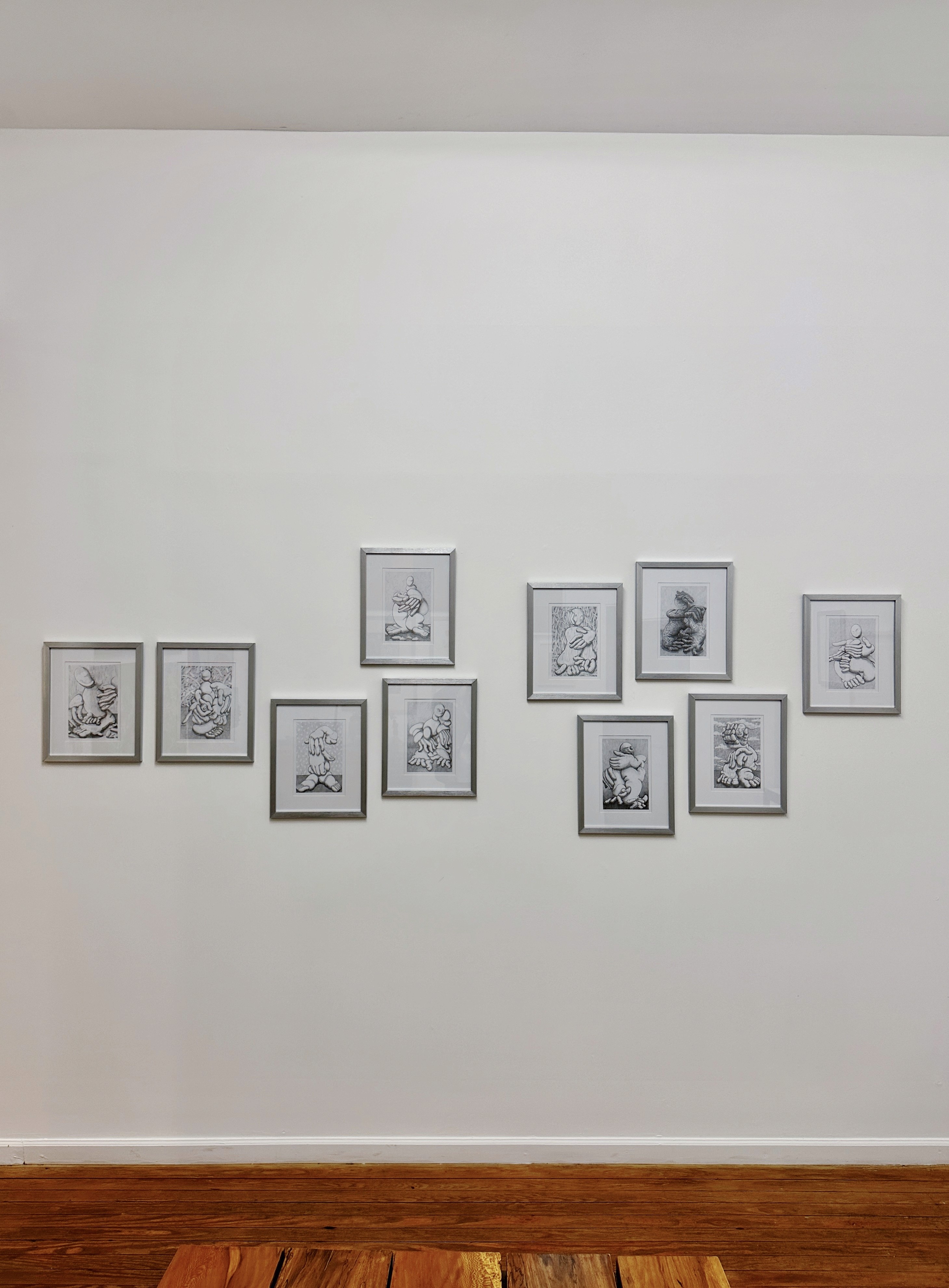 Ciertos personajes se acarician con manos exageradamente grandes, como si agudizaran los sentidos. Parecen querer sentir el propio cuerpo, dimensionarlo en toda su errática y difusa extensión. Un clima de ensimismamiento domina todas las escenas. Las posiciones de reposo, los ojos cerrados o la mirada pensativa confirman este estado de reconocimiento y afirmación de su propia identidad. Son colosos contemporáneos que cargan con su propio peso cuyas figuras se desvanecen, se re acomodan y se vuelven a armar.