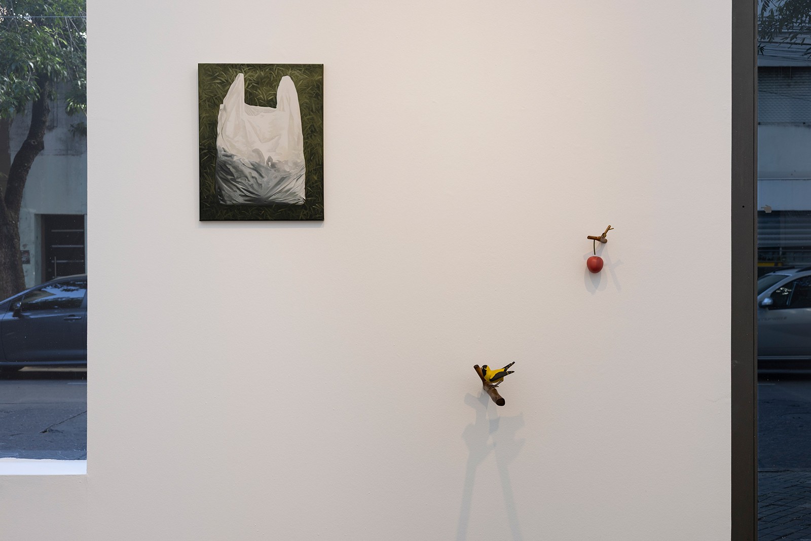 Honro a los materiales convirtiéndolos en parte de una naturaleza ficcionada, atesoro una bolsa y simulo ser ingenuo ante un pajarito que, no casualmente, es un cabecita negra. El mismo que trina recordándome que producir obras de arte en un contexto de crisis (económica y de valores) es un desafío, una instancia especial para recuperar trabajos con un potencial latente y me insta a escuchar/escucharme para nunca olvidar que la capacidad de imaginar es la mayor de las libertades.
